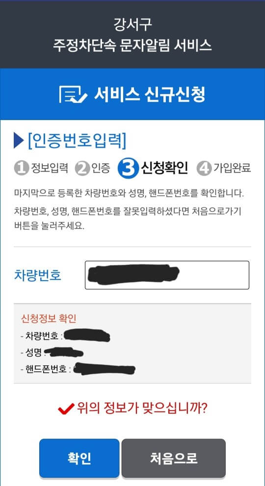 차량번호 신청자 이름 휴대전화 번호 입력 후 휴대폰으로 오는 번호 인증만 하면 완료입니다.