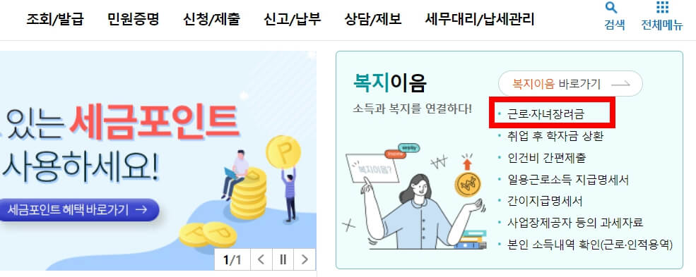 메인 페이지 복지이음 배너에서 근로. 자녀 장려금 클릭 후 신청 하면 됩니다.