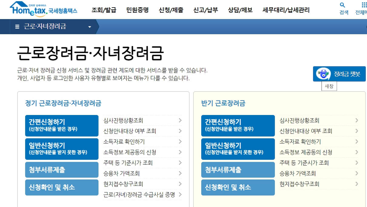 근로장려금은 반기신청이 가능하지만 자녀장려금은 정기신청만 가능합니다.